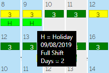 Moving the cursor over a code reveals a tool-tip displaying the details of the absence or work code, for example: