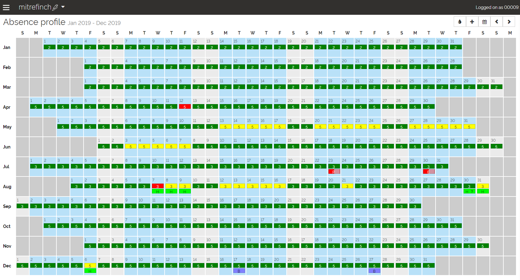 Your Absence profile for the current year will be displayed in a calendar format. For example: