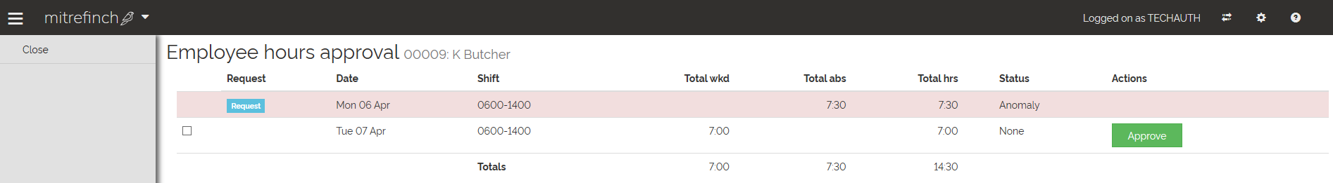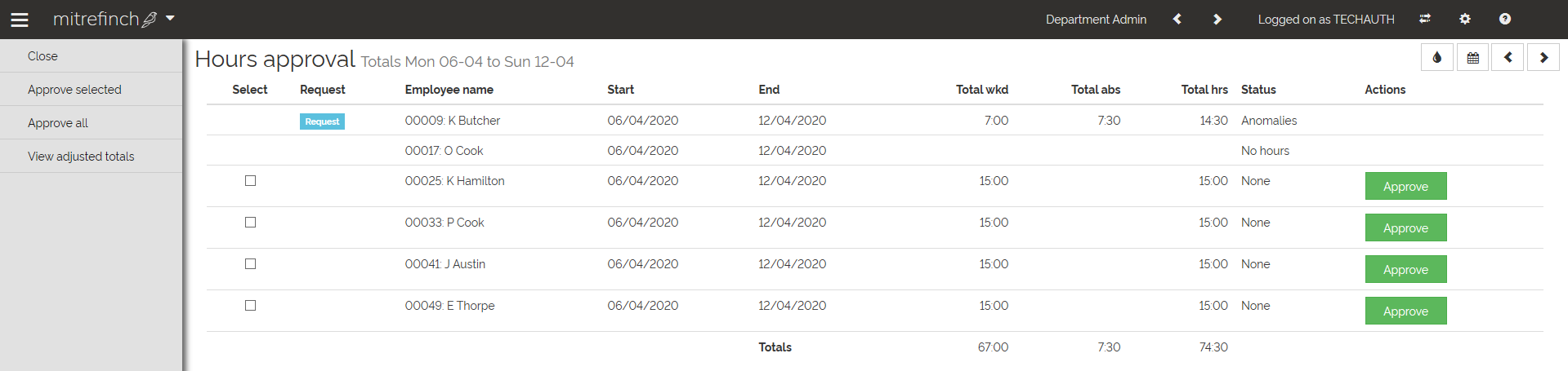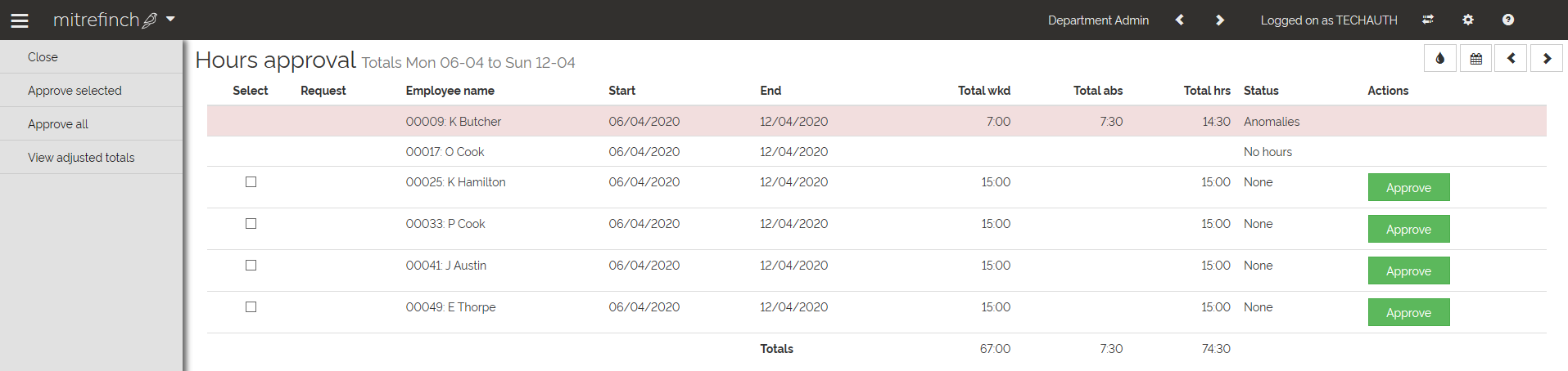 Once the anomaly is resolved, the hours can be approved by selecting the Approve buttons under the Action column, or by selecting the check-boxes for each row and clicking on 'Approve selected' from the left-hand pane or by using the action 'Approve all' in the left-hand pane to approve all the hours on the Employee hours approval page.