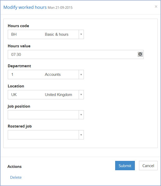This allows you to change the details recorded for the Worked and Absence hours. You can change the Hours code recorded for an Anomaly. For example, you might wish to change an unauthorised absence to a holiday or sickness code. Once you have made the changes, click Submit to save your changes and close the Modify worked hours pop-up and return to the Anomalies page. The system will then reprocess the record using the new Hours and any changes will be displayed in the record. This may introduce other Anomalies which will also need to be dealt with.