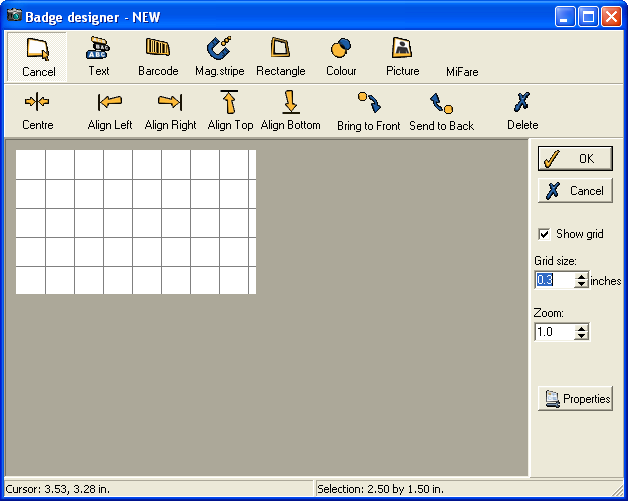 Show grid - when this option is ticked a grid is shown on the display, to help you align features evenly (this is only shown as a guide in the Badge designer, and does not affect the actual badge).