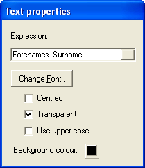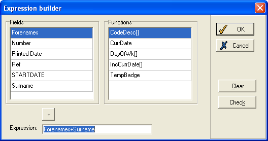 If you wish to enter any text which cannot be defined by an expression (for example, to have the word Visitor on all badges), then enter the required text as the expression enclosed in single quotation marks (e.g., 'Visitor'). This can then be combined with text from a field (e.g., 'Visitor'+' '+Surname).