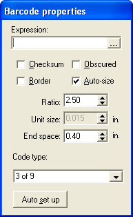 The Auto set up button, when clicked, returns all the barcode properties you have changed back to the default settings.