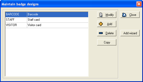 Select Maintain badges from the System menu, to open this table, which contains all badge designs currently on your system: