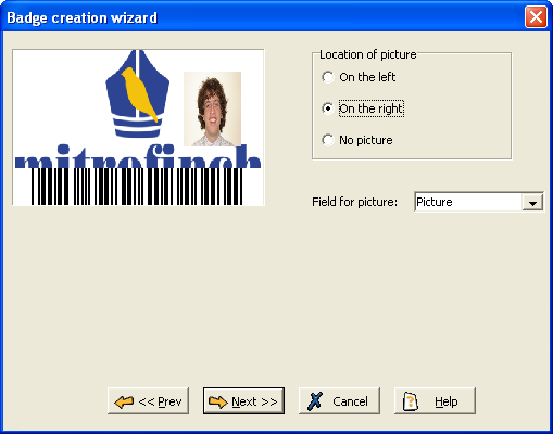 If you wish to include a picture on the badge, select the Field for picture (on standard data sets, Picture will be the employee's photograph). Once you have selected the field to use, select the Location of picture. You can select No picture if you do not want a picture on the badge.