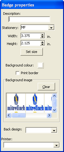 (NB: If you add any feature to the badge (from one of the six icons on the Badge designer), the Badge properties form will be replaced by a properties form for the feature added (Text properties, Barcode properties etc.). To retrieve the Badge properties form, you must then click within the background of the badge.)