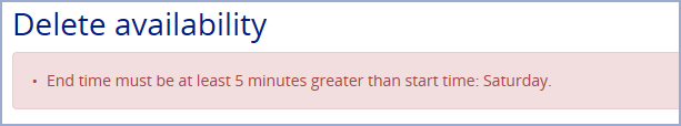 If you attempt to add or delete an Availability and select an end time before the start time, you will see the following warning at the top of the page: