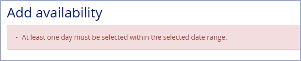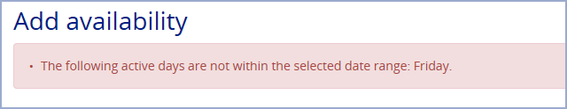 If you attempt to add or delete an Availability and select an active day outside the selected date range, you will see the following warning at the top of the page: