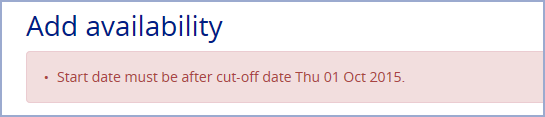 If you attempt to add, delete or copy an Availability to a date before a cut-off date set by your system administrator, which by default is the current date, you will see the following warning at the top of the page: