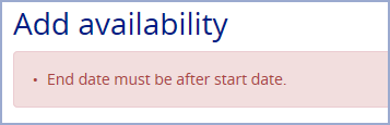 If you attempt to add, copy or delete an Availability and select an end date before the start date, you will see the following warning at the top of the page: