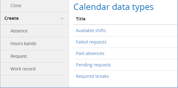 The list contains the Title of the data type, with one per row. Additional options are available in the left-hand pane to Create an Absence, Hours bands, Request or Work record data type.