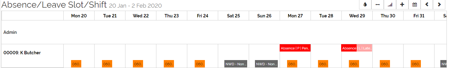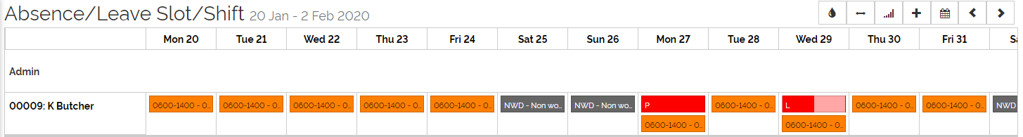 The Grid layout has days in columns with individual Employees in the rows along with their name and Employee ID in the side header. Each cell in the grid layout has blocks of items that cover the entire width. In the below example, a calendar with the Absence and Shift data types displays a Shift block covering the width of a cell, with Absences appearing above the Shift: