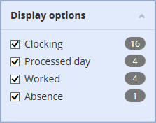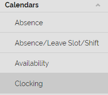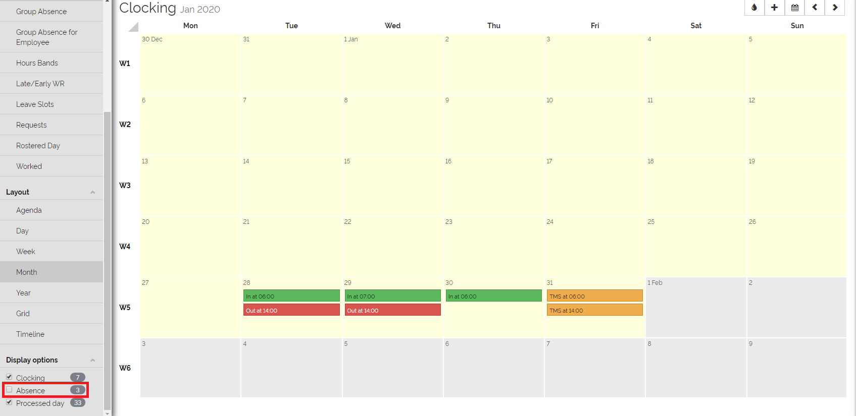The options available are the Data types within the selected calendar that can be displayed. The amount of instances they appear on the calendar are next to it in parenthesis. A checked box means it will be displayed on the calendar and an unchecked box means it will be hidden. The example below is how the 'Clocking' calendar displays with the Absence option not ticked: