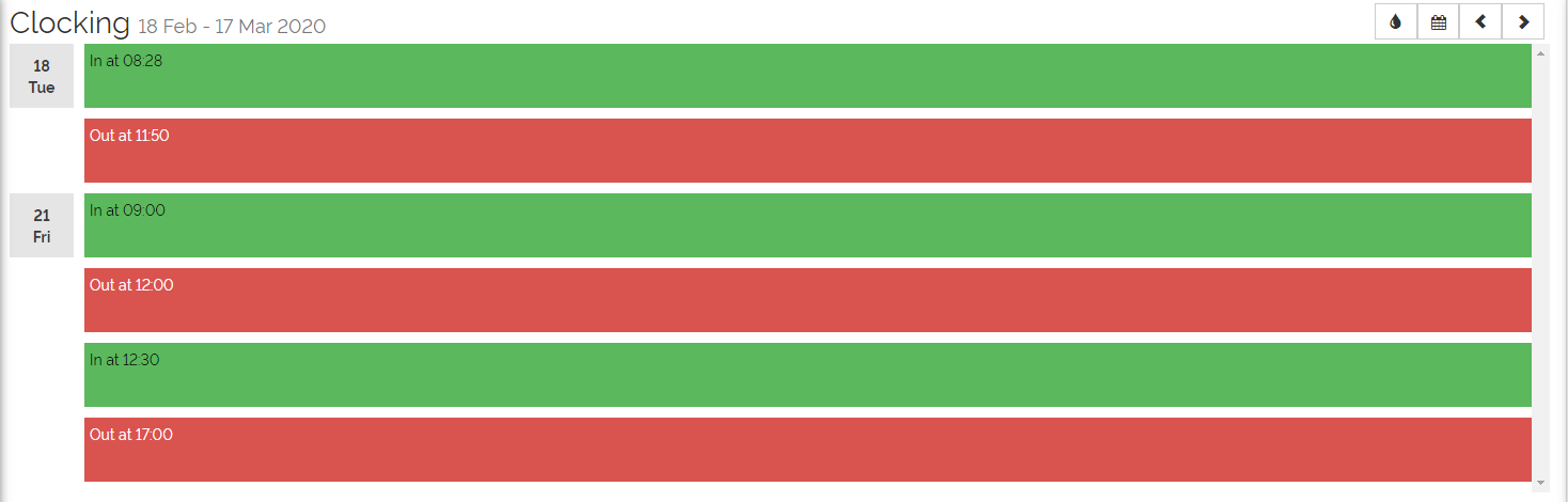 The 'Agenda' Layout only displays the date and the details of what has happened or has been planned for that day. The 'Clockings' calendar used for the below example uses the Data types Clockings.