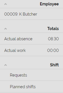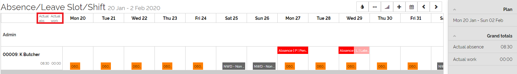 Both layouts can contain a Totals heading at the top of the Employee column. This is set up by your system administrator and clicking on the Totals headings opens up the Totals details in the right-hand pane for more information. For example, selecting the highlighted area will open up the grand total and individual day totals in the right-hand pane: