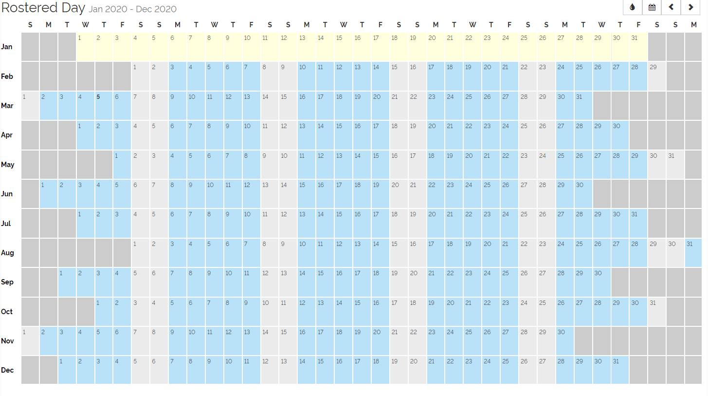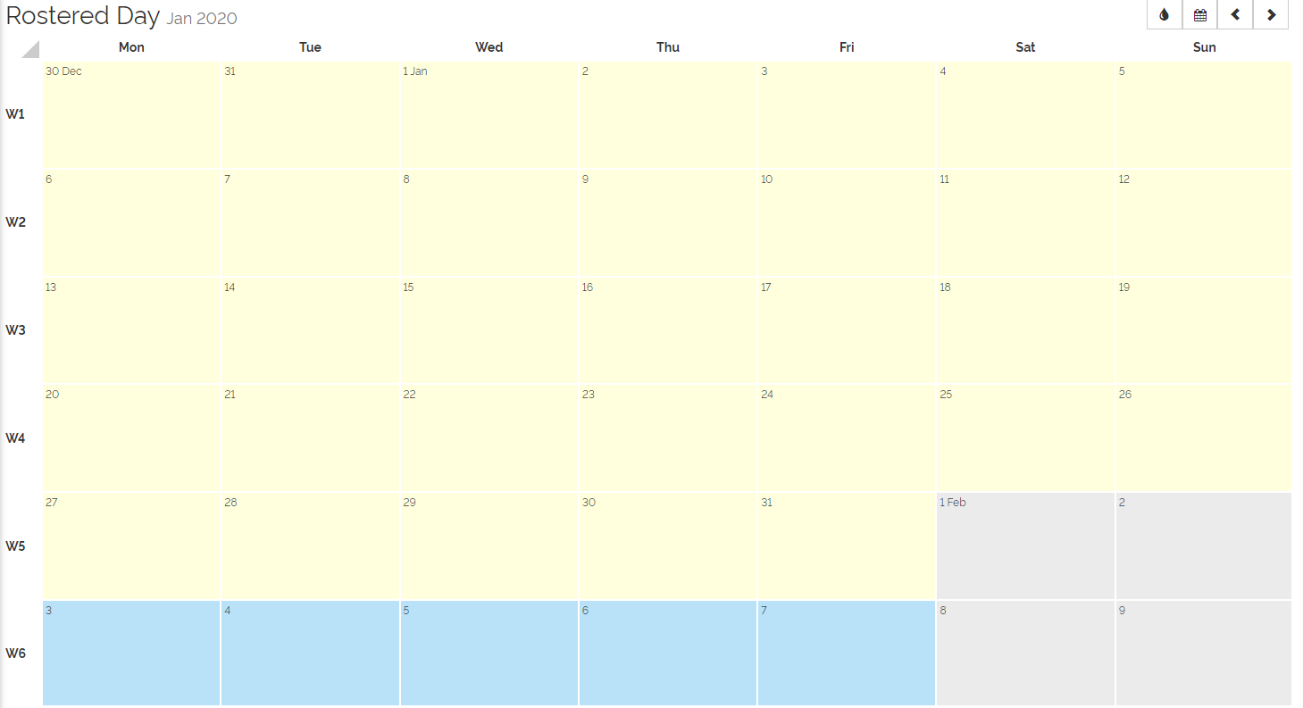 The 'Month' option lays out the calendar with weekdays in columns and full weeks in rows. The 'Rostering availability' calendar used for the following examples uses the Data types: Rostered days and Processed days. The days that are processed are highlighted light yellow and the non-processed days are highlighted white. The days that are rostered are highlighted light blue and the non-working days are highlighted grey. For example:
