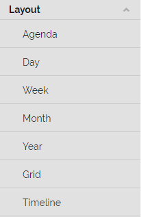 Period — a drop down list to change the period of time the calendar displays to a day, 1 week, 2 weeks, 4 weeks or a month. Note: only available in the grid or timeline layout