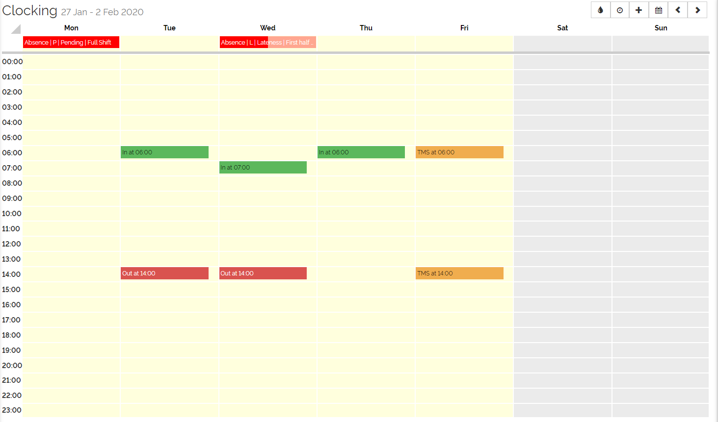 The 'Week' and 'Day' Layouts have the days of the week in the columns and have hourly time slots for the rows. In the 'Clockings' calendar, the days that are processed are highlighted light yellow and the non-processed days are highlighted grey. Absences are displayed in the top bar for specific days. For example: