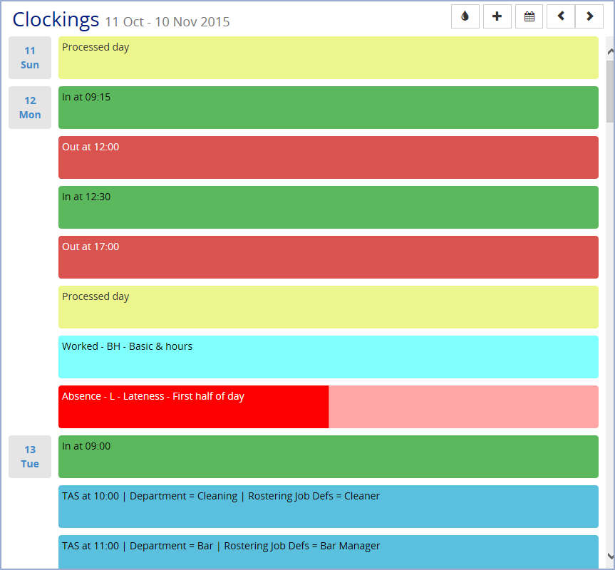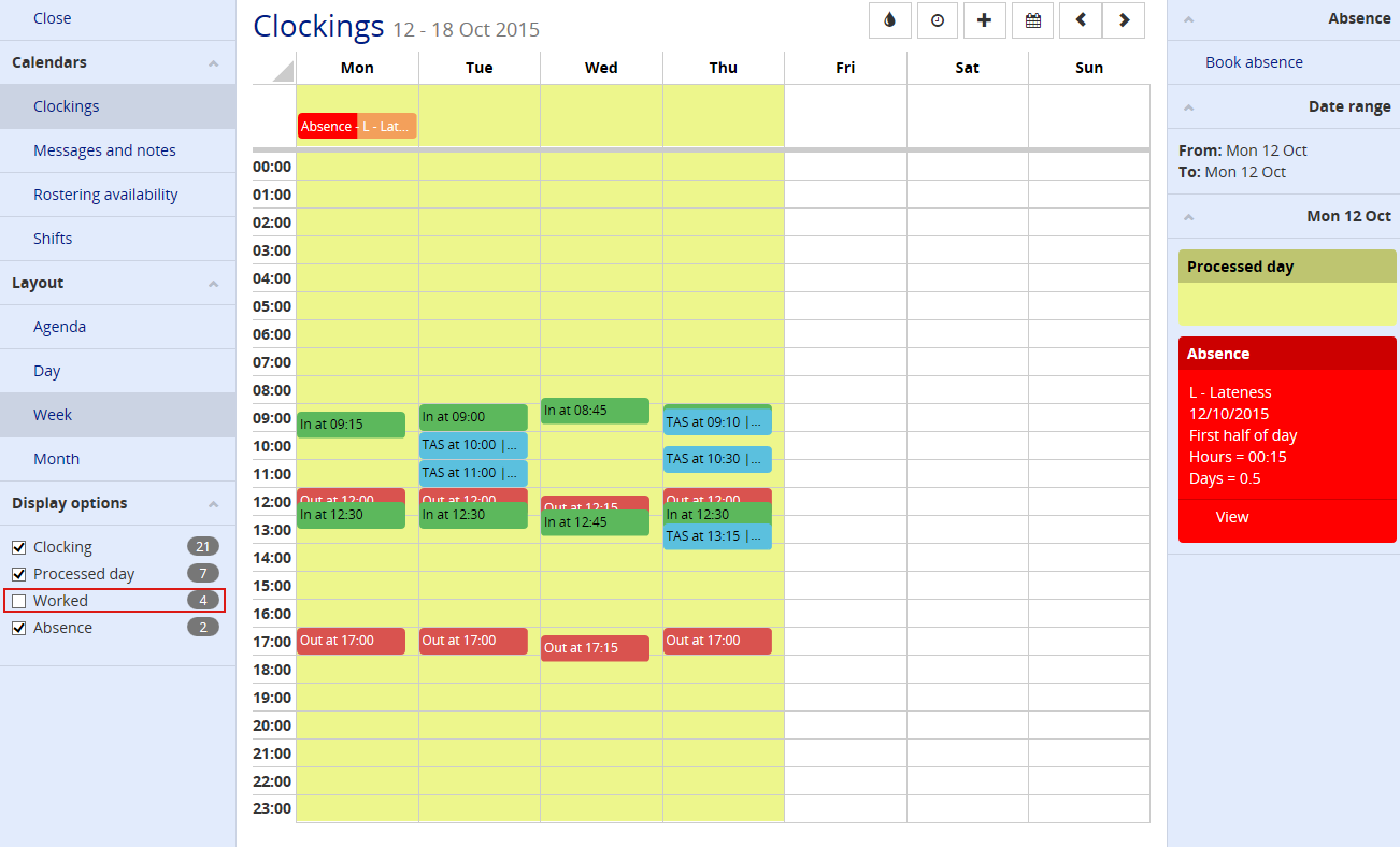 The 'Agenda' Layout only displays the date and the details of what has happened or has been planned for that day. The 'Clockings' calendar used for the below example uses the Data types: Clockings, Processed days, Absence and Worked hours: