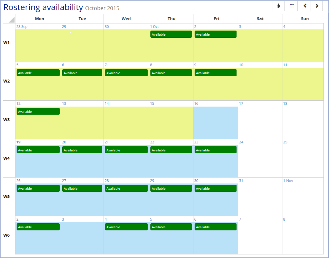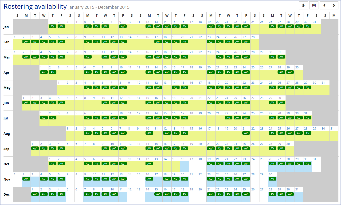 The 'Month' option lays out the calendar with weekdays in columns and full weeks in rows. The 'Rostering availability' calendar used for the following examples uses the Data types: Availability, Rostered days and Processed days. The days that are processed are highlighted light yellow and the non-processed days are highlighted white. The days that are rostered are highlighted light blue and the non-working days are highlighted white. For example: