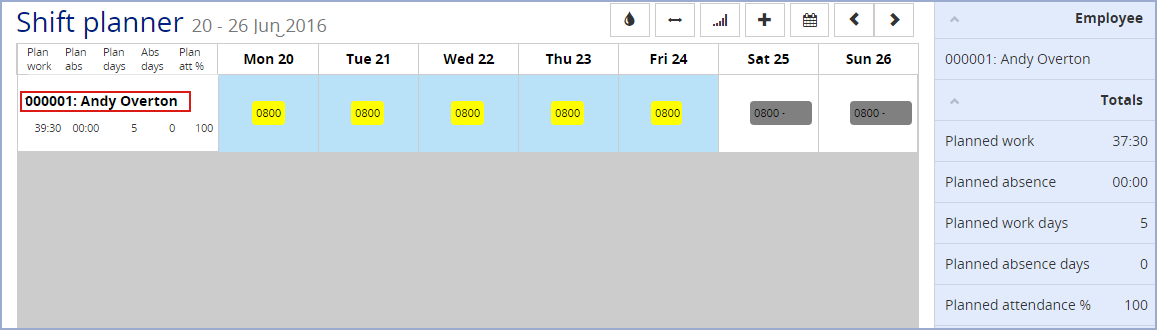 Note: the totals for an individual Employee can be viewed by clicking on the Employee ID or Name and the totals for the Employee row will appear in the right-hand pane. For example: |