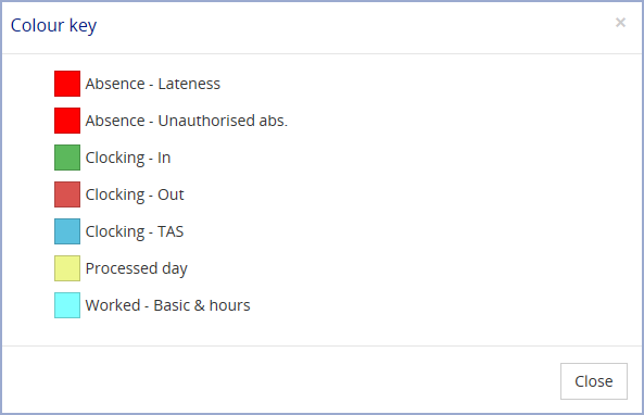 The key shows the colour and a description for each item on the 'Clockings' calendar. Click Close to dismiss the window.
