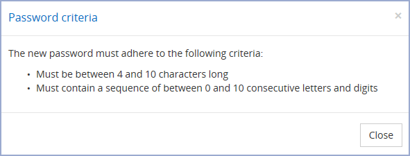 First enter your existing password in the Current password field, then enter a new password in the New Password and Confirm New Password fields. The value you choose for your new password must meet certain criteria or rules which have been defined by your system administrator. Click Password criteria to display the rules, for example: