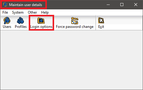 A new preference has been added that allows you to nominate a default Lookup for Users created in this way. The new preference is located in the login options window. You can access the login options by opening the System menu, clicking Maintain users, and then selecting the login options button: