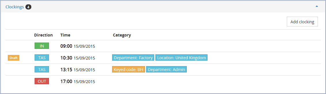 The time and date of the clocking, for example '09:15 15/09/2015'