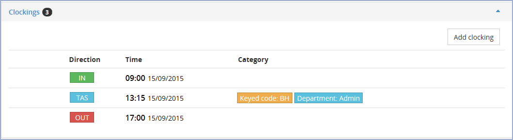 The panel displays details of any Clockings you made during the day with each displayed in a separate row. The following example shows three Clockings for the day:
