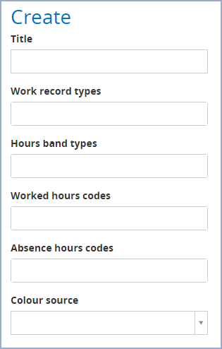 Clicking on Work record in the left-hand pane opens the Create page to create a Work record data type. The fields available are the same as the Hours bands Create page but with an extra field at the bottom: