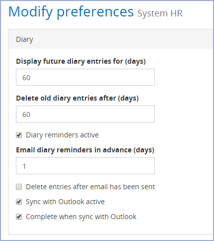 Sync with Outlook active — if enabled, allows all diary entries to be replicated in the Tasks section of the manager's Microsoft Outlook account. The manager can then deal with tasks in a manner which may be more familiar. Note: if the preference 'Complete when sync with Outlook' is not enabled, the manager will have to manually set the diary entries to complete on the Dairy page for any diary entries set to complete in Microsoft Outlook