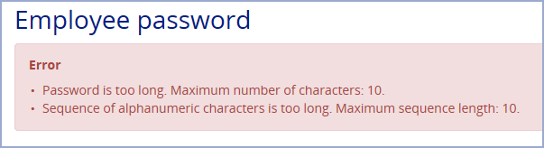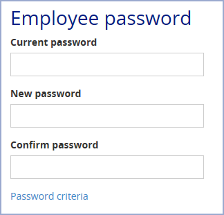 In addition to resetting an Employee's password, you also have the option to enter a new password for them. To do this, enter a value for their new password in both the New password and Confirm password fields. The value you choose for their new password must meet certain criteria or rules which have been defined by your system administrator. Click Password criteria to display the rules, for example: