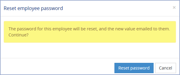 Select Reset password to complete the process, or Cancel to keep the Employee's current password in place. If you choose to Reset an Employee's password, they will receive an email to notify them of the change and the password will be a single-use one, allowing them to choose a new one upon their first login.
