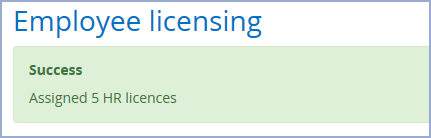 Click Cancel to return to the Employee licensing page or click Submit to assign the licence(s) to all your Employees currently selected in Employee licensing and return to the updated Employee licensing page. A message will appear at the top of the page if successful:
