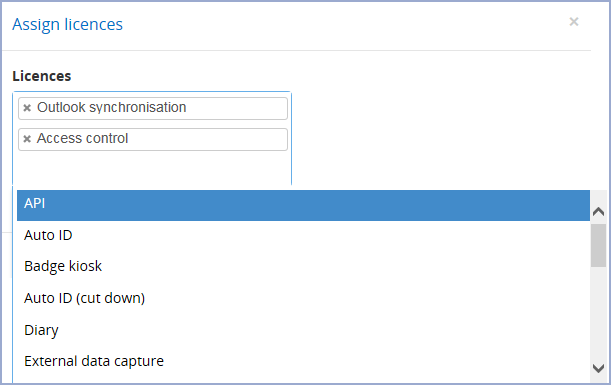 You can select multiple licences to assign, click on a space in the selection box to open a drop-down list to select a licence or click X to remove a licence from the selection.