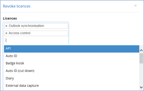 You can select multiple licences to revoke, click on a space in the selection box to open a drop-down list to select a licence or click X to remove a licence from the selection.
