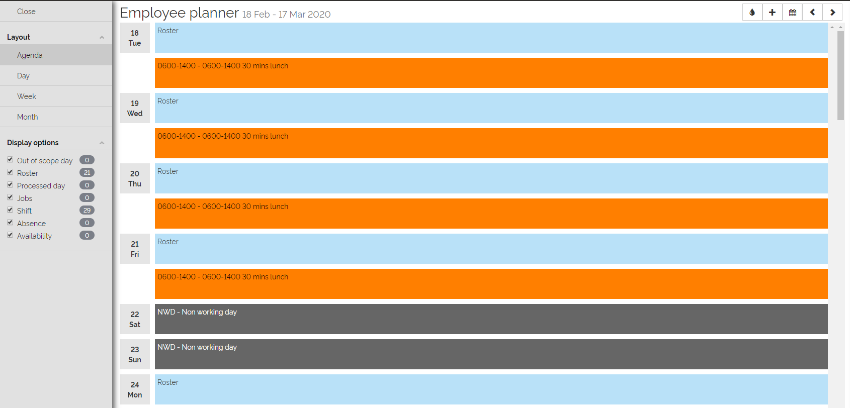 The main area of the Employee planner contains a table showing your Shift pattern for each day in a particular period of time. The default agenda view covers a full month period and the days are displayed cascading down the page. The time period covered is indicated at the top of the screen and in the example this is from '17th February to 23rd February'. You can view past or future periods of time using the buttons in the top right-hand corner of the page and change the Layout of the Employee planner using the options in the left-hand pane.