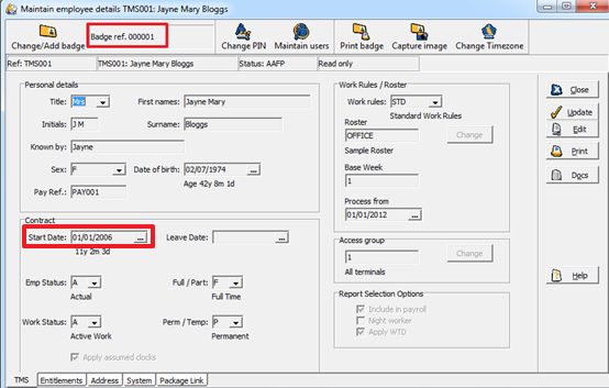 If the badge number is incorrect within the TMS Employee Details, then click on ‘Change/Add badge’ located next to the Badge Ref.
