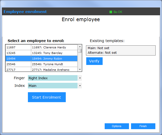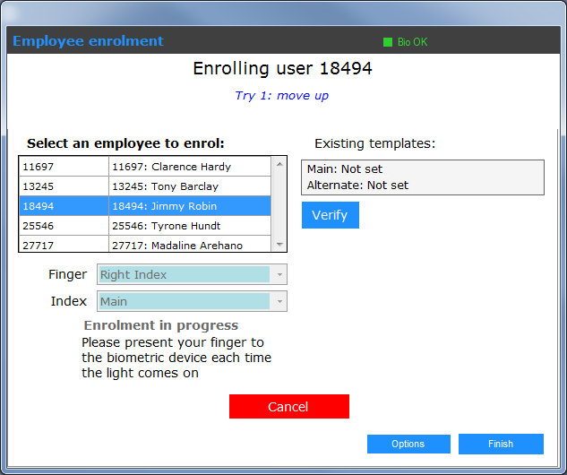 Index – Main or Alternate. Each employee must record a Main finger for clocking. Alternate finger templates are an optional feature. If an employee damages their Main finger, they can still clock using the Alternate finger.