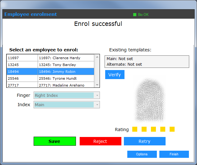 Employee enrolment records employee fingerprint templates for use with the clocking system.