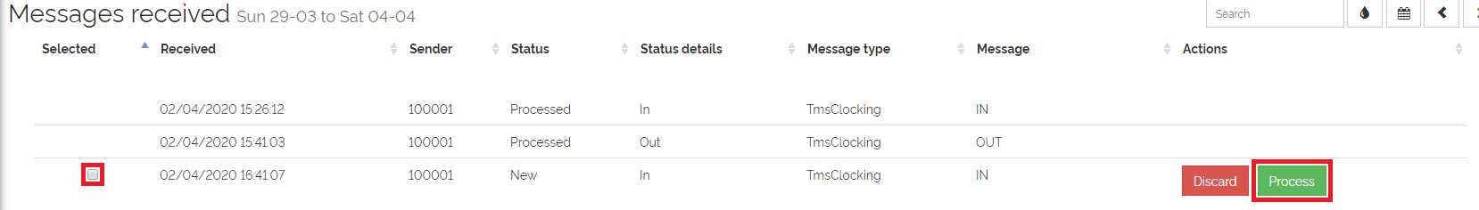 If the employee has an API license, then the SMS clocking will automatically be processed by the Processor. If not, then SMS clockings will be sent to the Messages received page of TMS 8, whereupon you can click the Process button to accept SMS clockings. To process an SMS clocking, select them with the checkbox and click Process: