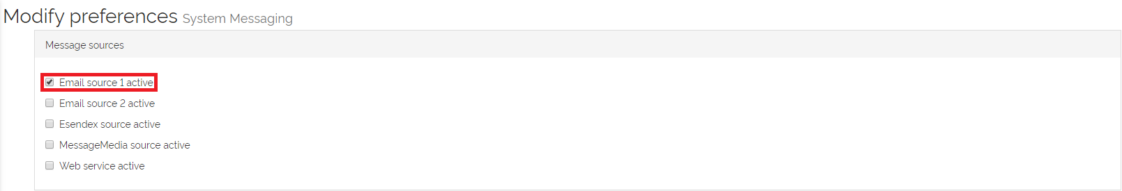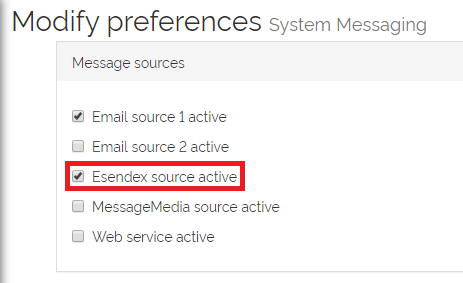 Next, return to the Messaging preferences and enable the Message source: Esendex source active (the setting that was previously set to Email source 1 active).