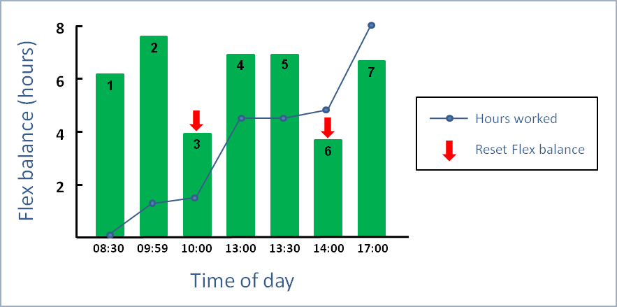 3 At 10am (a time defined by the system administrator in the Shift definition), the Flex balance is reset.