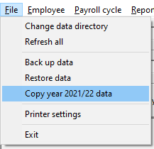 If you are using a single data folder, or a small number of folders, the easiest way to do this is to use Flexipay’s built-in tool. This is located under File (in the top left of the Flexipay application), then there is an option called Copy year 2021/22 data.
