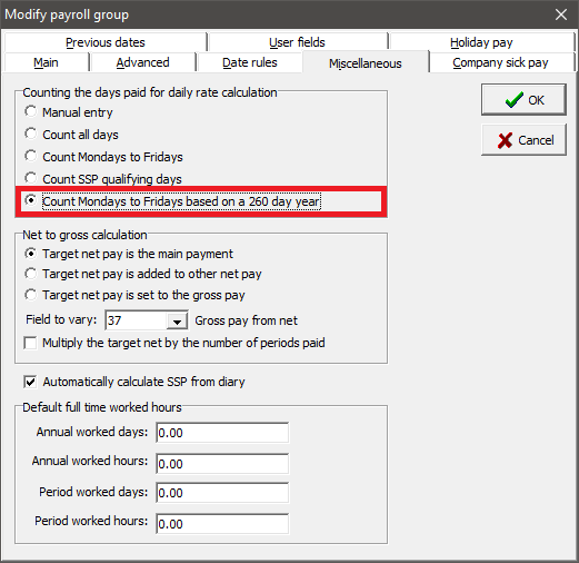 Note: this error only applies to Pay groups using the Count Mondays to Fridays based on a 260 day year rule (the option that treats all months across the tax year as an equal length). This can be found in the Modify pay group window: