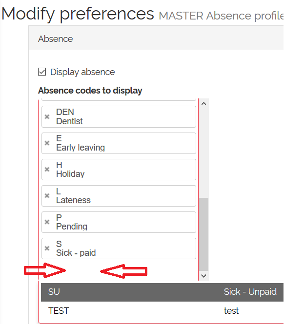 When viewing the Absence Profile, you can choose which absence codes to display. You will need to ensure you have the correct absence codes displayed, or any absence you add in will not show up despite it being recorded by the system.