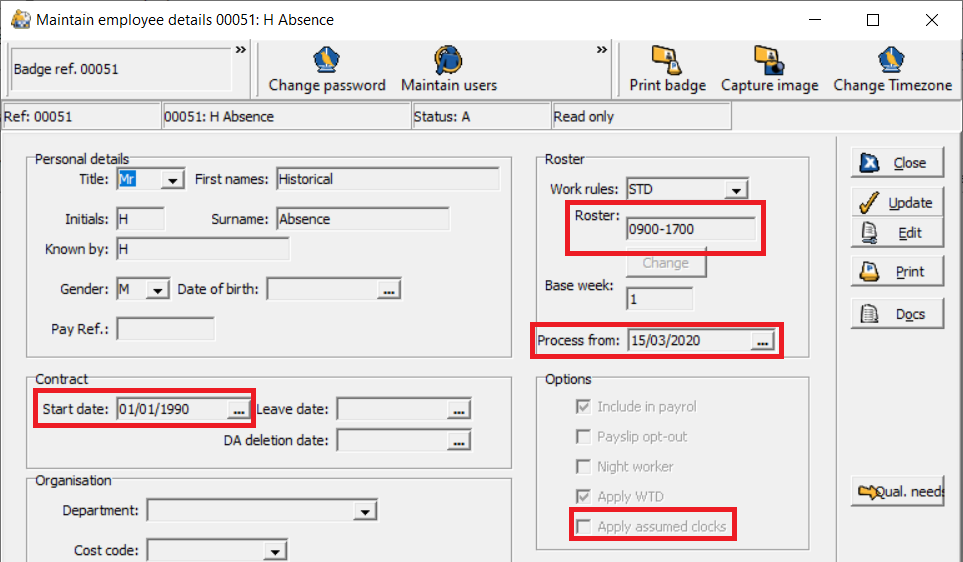 First you will need to ensure your employees are correctly set up to allow the historical absences to be entered. The fields you will need to check are below. Please note, your system will have been customised for you use, o these fields may be in slightly different locations or on a different panel.