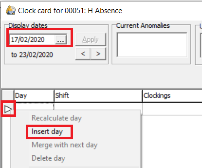 To manually create the work records using WinTMS, go into the employee’s clock card, scroll to the required date, then right click on the left hand bar of the table and select “Insert day”. You can then choose the correct shift and TMS will add in the expected absence.