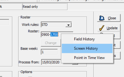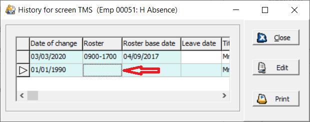 In WinTMS, go to the “Employee Details” screen, right click the “Roster” field and click “Screen History”. This will show a screen detailing the historical values associated with each field. If the “Roster” field is blank for any of the dates that you will be inputting historical absences, click the “Edit” button and enter the correct roster.